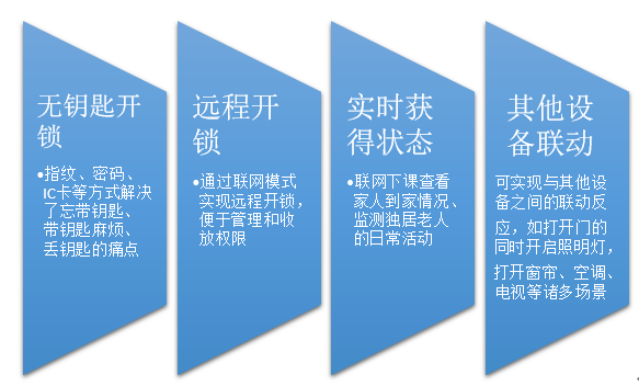 實(shí)現(xiàn)“無鑰匙開鎖”,簡(jiǎn)便化、智能化明顯。智能門鎖的核心功能是“無鑰匙開鎖”,避免傳統(tǒng)的丟失鑰匙等行為,簡(jiǎn)便化突出。在此基礎(chǔ)上借助聯(lián)網(wǎng)功能,互聯(lián)網(wǎng)時(shí)代的智能門鎖在技術(shù)上實(shí)現(xiàn)了高速迭代,可實(shí)現(xiàn)分發(fā)開鎖權(quán)限、獲得門鎖狀態(tài)、與其他設(shè)備聯(lián)動(dòng)等多元化功能,具備更豐富和便捷的遠(yuǎn)程和管理功能,實(shí)現(xiàn)家居場(chǎng)景的物物聯(lián)動(dòng)、安防保護(hù)。